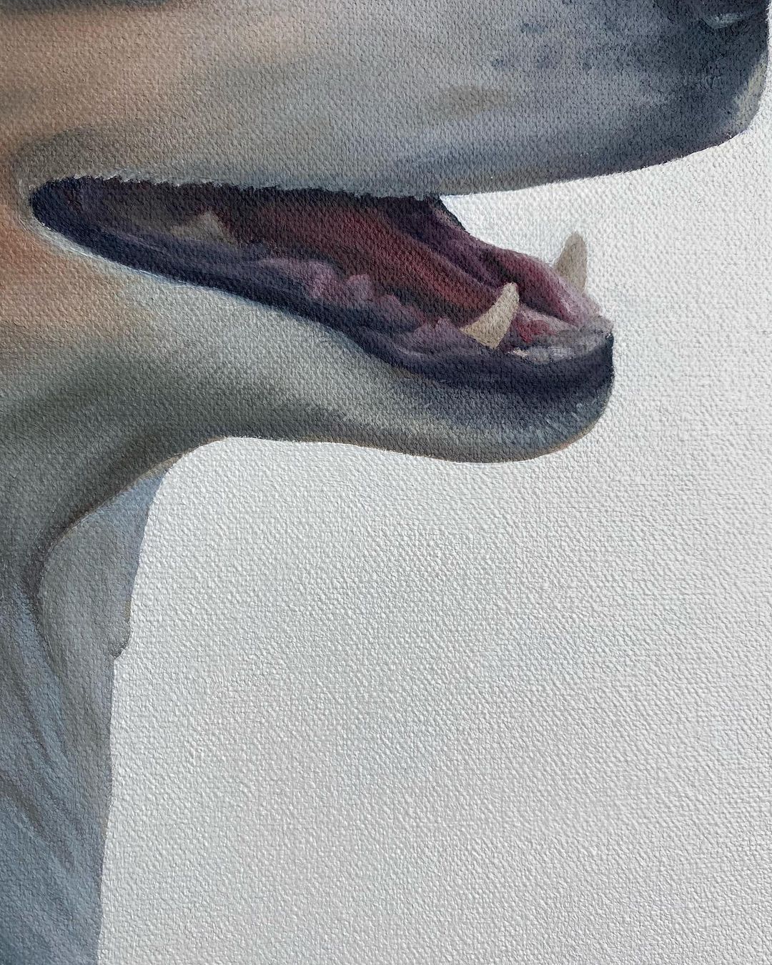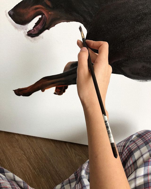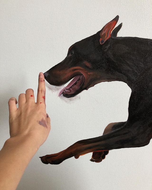 This Doberman is part of the Jumping Dogs series of paintings that depicts dogs taking a leap across two large canvases.