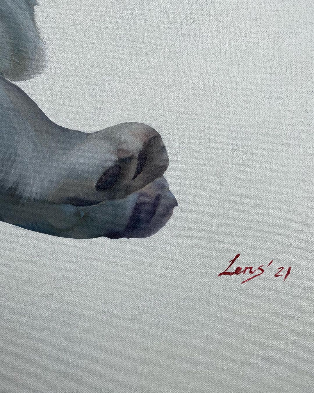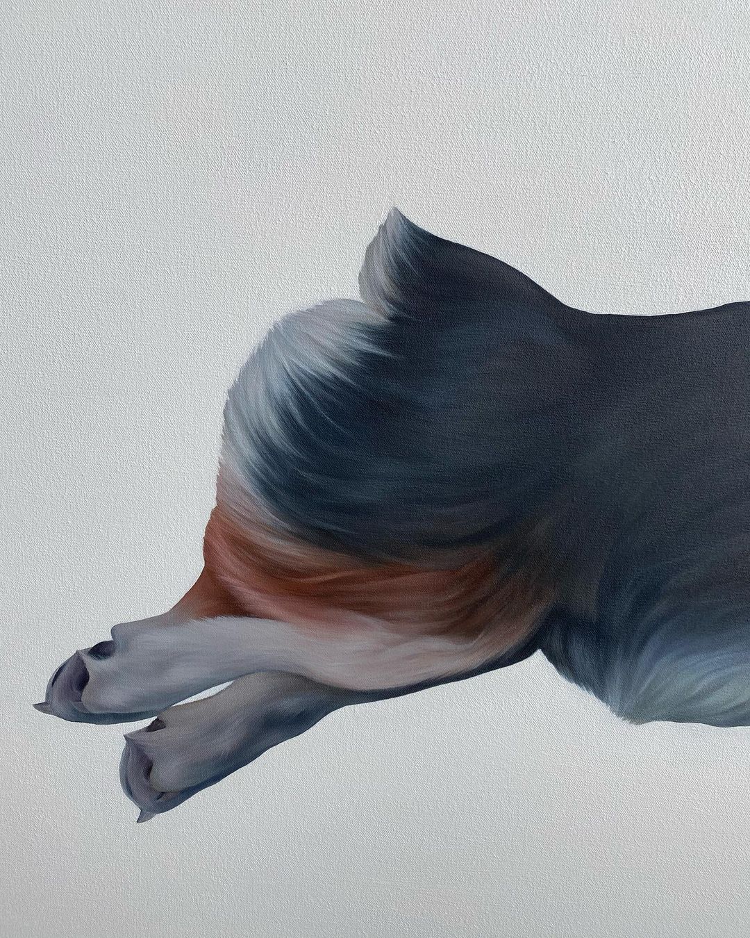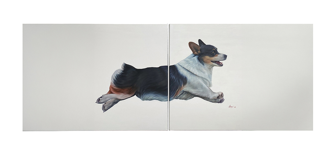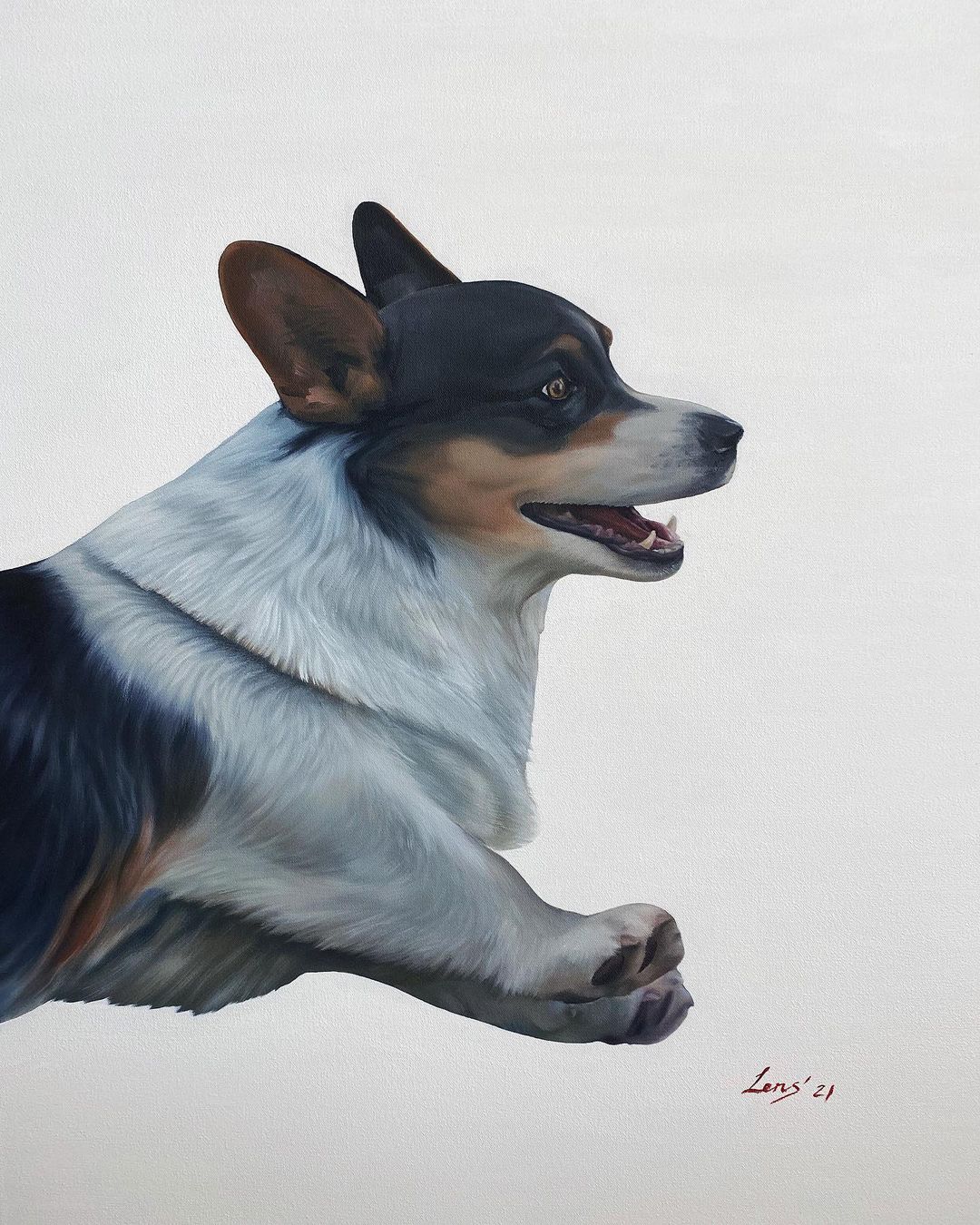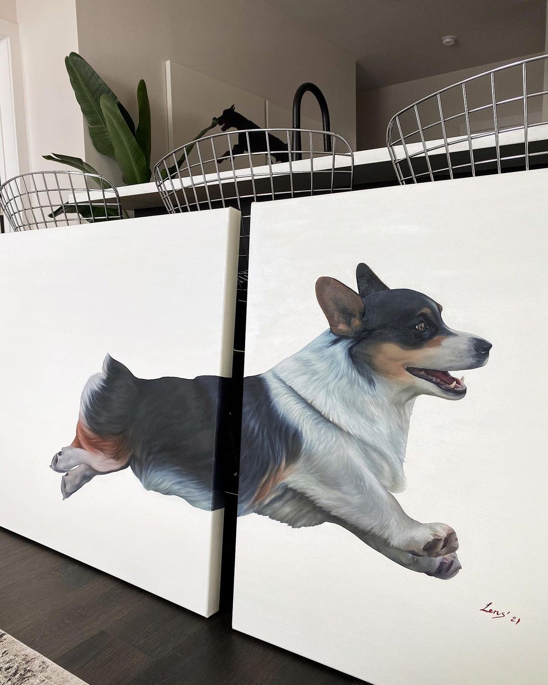 This Corgi is part of the Jumping Dogs series of paintings that depicts dogs taking a leap across two large canvases. This particular Corgi is a commissioned portrait of a beloved family dog.